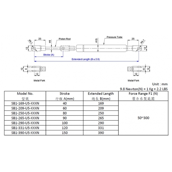 ※建議設計、使用氣壓棒時,有效行程需再預留5~10mm防止撞擊氣壓棒缸體而造成氣壓棒損壞。