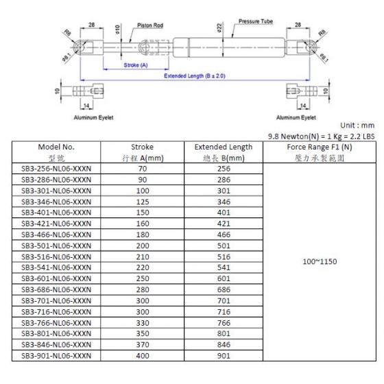 ※建議設計、使用氣壓棒時,有效行程需再預留5~10mm防止撞擊氣壓棒缸體而造成氣壓棒損壞。