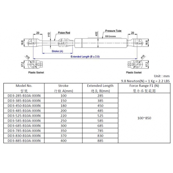 ※建議設計、使用氣壓棒時,有效行程需再預留5~10mm防止撞擊氣壓棒缸