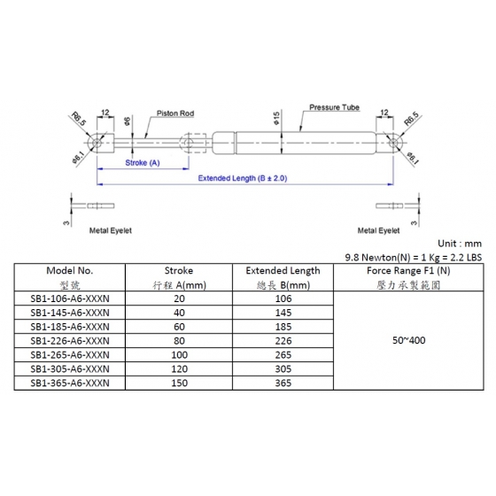 ※建議設計、使用氣壓棒時,有效行程需再預留5~10mm防止撞擊氣壓棒缸體而造成氣壓棒損壞。