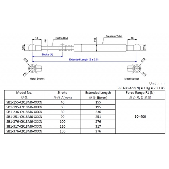 ※建議設計、使用氣壓棒時,有效行程需再預留5~10mm防止撞擊氣壓棒缸體而造成氣壓棒損壞。