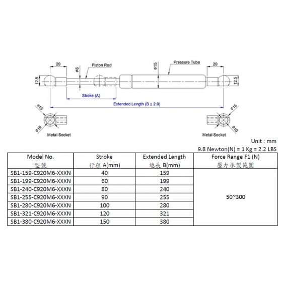 ※建議設計、使用氣壓棒時,有效行程需再預留5~10mm防止撞擊氣壓棒缸體而造成氣壓棒損壞。
