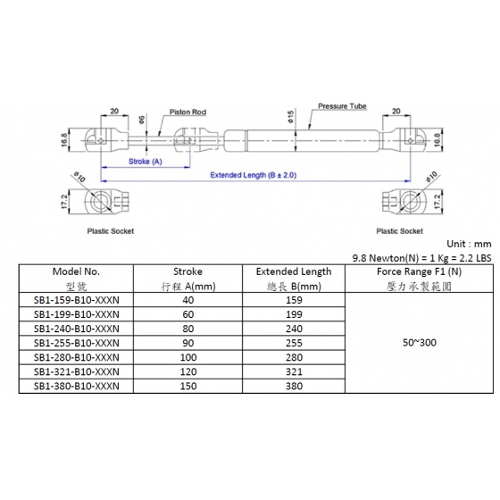 ※建議設計、使用氣壓棒時,有效行程需再預留5~10mm防止撞擊氣壓棒缸體而造成氣壓棒損壞。