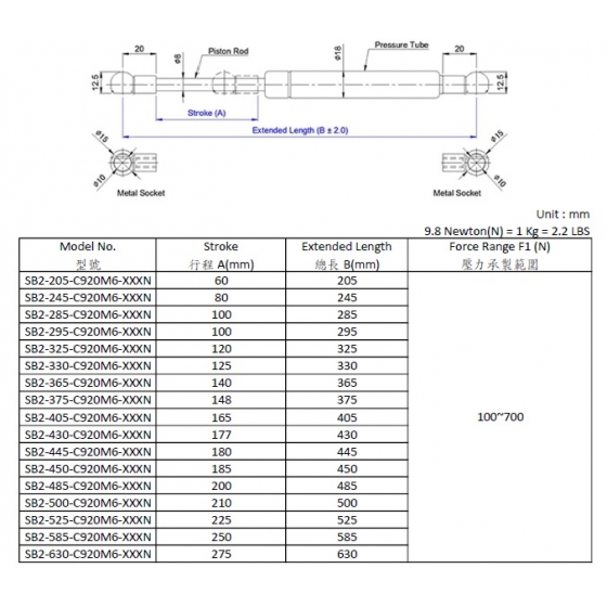 ※建議設計、使用氣壓棒時,有效行程需再預留5~10mm防止撞擊氣壓棒缸體而造成氣壓棒損壞。