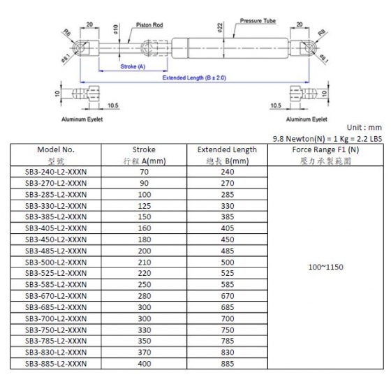 ※建議設計、使用氣壓棒時,有效行程需再預留5~10mm防止撞擊氣壓棒缸體而造成氣壓棒損壞。