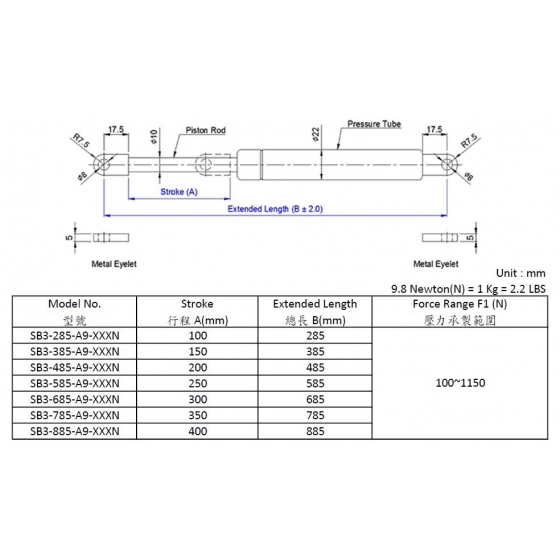 ※建議設計、使用氣壓棒時,有效行程需再預留5~10mm防止撞擊氣壓棒缸體而造成氣壓棒損壞。