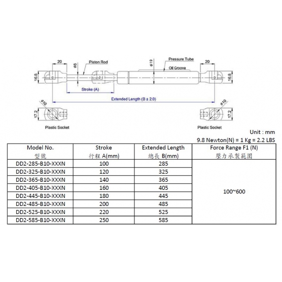※建議設計、使用氣壓棒時,有效行程需再預留5~10mm防止撞擊氣壓棒缸