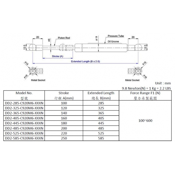 ※建議設計、使用氣壓棒時,有效行程需再預留5~10mm防止撞擊氣壓棒缸
